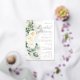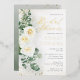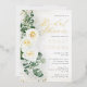 Elegant and classy boho-chic white rose and eucalyptus floral "Bridal Shower" real gold foil script text design with dark gold-toned confetti and shadowing. Name is also in real gold foil. Back features a watercolor gradient sage green background with green and sparse dark gold-toned confetti splatters.