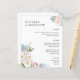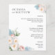 Elegant botanical chic wedding menu with floral accent at the corners featuring your names in elegant serif bold and a bouquet of white blue and pink roses and peonies in soft watercolors. Personalise with your wedding dinner details beneath.