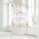 An elegant baby girl shower frosted acrylic welcome sign with "a little wildflower is on her way" written in light grey typography and a stylish purple script, and boho-inspired whimsical watercolors of dainty purple, pink and yellow wildflowers. Add the name of the mother-to-be in simple purple lettering.
