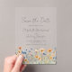 This rustic boho design features a watercolor border of orange and blue wildflowers along the bottom. The words "Save the Date" and the couple's names appear in stylish charcoal grey handwriting script, with the remaining text in sans serif font on a clear background.