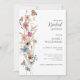 Earthy boho wildflower bridal shower invitation featuring a pretty watercolor illustration of wildflowers in rose pink, blue, and light terracotta hues. Pastel lavender background on the back with a flora pattern overlay.