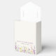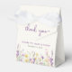 Cute light taupe favour boxes for your baby girl shower featuring "thank you" and "a little wildflower is on her way" in light grey typography and a stylish lavender purple script and boho-inspired watercolors of purple, pink, and yellow wildflowers. Personalise the mother's name and shower date in simple lavender purple and grey lettering.