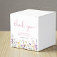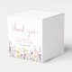 Elegant favor boxes for your baby girl shower featuring "thank you" and "a little wildflower is on her way" showcased in light grey typography and a stylish pink script, and boho-inspired whimsical watercolors of dainty purple, pink and yellow wildflowers. Add the name of the mother-to-be in simple pink lettering.