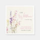 Elegant light cream baby girl shower napkins featuring "a little wildflower is on her way" showcased in a blend of modern grey typography and a whimsical pink calligraphy script, and a boho-inspired watercolor bouquet of purple, pink and yellow wildflowers.