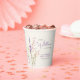 Elegant light cream paper cups for your baby girl shower featuring "a little wildflower is on her way" showcased in a blend of soft grey typography and a whimsical purple script, and a boho-inspired watercolor bouquet of purple, pink and yellow wildflowers.