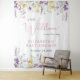 An elegant baby girl shower welcome tapestry and photo backdrop featuring "a little wildflower is on her way" in a blend of light grey typography and a stylish pink script, and boho-inspired whimsical watercolors of dainty purple, pink and yellow wildflowers. Add the name of the mother-to-be in simple pink lettering.