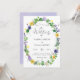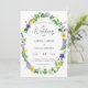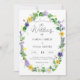 This is a lovely rustic botanical wildflower themed wedding invitation. The design features a wreath made with a variety of spring wildflowers including yellow daffodils, purple pansies, clovers, lavender, sweetpeas, dandelions, tulips and fern and ivy greenery.