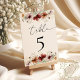Add a touch of seasonal charm to your reception with this Boho Wildflower Wedding Table Number. Featuring soft watercolor floral illustrations in rich autumn tones—such as terracotta, dusty purple, and burgundy—each card brings warmth and elegance to your tablescape. The design blends rustic charm with a modern boho aesthetic, perfectly suited for fall wedding receptions in outdoor, barn, or garden settings. Both stylish and functional, these table numbers help guide your guests while enhancing your overall décor with a romantic, nature-inspired touch.
