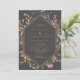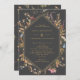 An elegant wedding invitation with watercolor wildflowers and leaves surrounding a gold geometric frame on a dark grey background. Personalise your details with gold text. The reverse features a pattern of watercolor wildflowers also on a dark grey background. Perfect for a fall wedding.