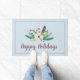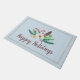 Festive holiday front doormat features Boho style bouquet features fir branches, feathers, holly, berries and white flower on blue background. Customise with name, seasonal message or other festive text