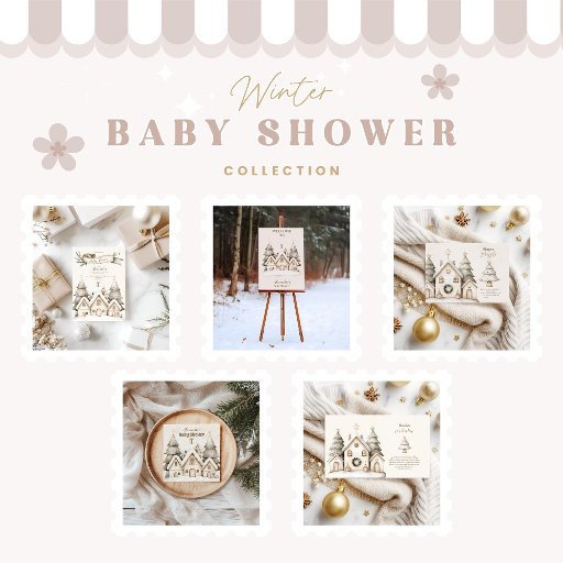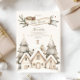 A charming winter baby shower invitation featuring hand-painted cosy cottages nestled among snowy fir trees, topped with festive gold stars. A rustic wood banner and delicate pinecone accents bring a warm, woodland Christmas feel. Neutral taupe tones blend with soft ivory snow, perfect for a gender-neutral celebration in a magical winter wonderland.