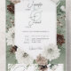 ALSO AVAILABLE WITH A QR CODE TO SCAN IN THE RSVP AREA OR WITHOUT DINNER SELECTION OPTIONS. This is a wedding invitation with a soft green background, lightly distressed with white accents, and features an elegant frame made of winter pine greenery, adorned with pine cones and delicate white flowers. The design embraces the natural beauty of the winter season, blending elements of serenity, sophistication, and timeless romance.