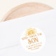 This sun-themed baby shower sticker features the text "Here Comes The Son" in stylish typography with a cute yellow watercolor sun. Easily customisable. Original Watercolor © Michele Davies.