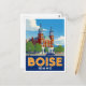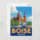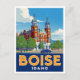 A striking vintage-style travel poster showcasing a historic red-brick building with twin spires, representing the iconic architecture and charm of downtown Boise, Idaho. Set against a bright blue sky, this design captures the unique character of the city. Perfect for Idaho residents, travelers, and collectors of retro city travel posters.