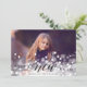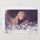 Elegant holiday photo card features a full bleed landscape-orientated photo with a bokeh light flare overlay for a festive and bubbly look. "Happy New Year" is overlaid in black script and block lettering, with your name(s) beneath. Add two additional photos to the back, along with a custom message, on a neutral greige and cream botanical patterned background.