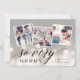 Elegant holiday photo card features three square photos in a collage layout, with a bokeh light flare overlay for a festive and bubbly look. "So very merry" is overlaid in black script and block lettering, with your name(s) and the year beneath. Cards reverse to a neutral botanical patterned background.