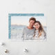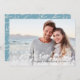 Elegant holiday photo card features a full bleed landscape-orientated photo with a bokeh light flare overlay for a festive and bubbly look. "Warmest Wishes" or your choice of holiday greeting is overlaid in black script lettering, with your name(s) and the year alongside. Cards reverse to a wintry blue botanical patterned background.