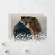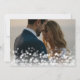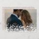 Elegant wedding thank you card features a full bleed landscape-orientated photo with a sheer bokeh light flare overlay for a chic bubbly look. "With our thanksr" or your choice of message is overlaid in black script lettering, with your names alongside. Add two additional photos to the back, along with a custom pre printed thank you message, on a neutral botanical patterned background.