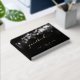 An elegant and sophisticated black and gold wedding guestbook featuring black with shimmering white bokeh lights in the background with gold foil swash calligraphy with your names on the front, spine and back covers in a modern san serif font. The book reads, "guest book,' on the front and wedding on the back in a swash font script with your names and date.