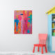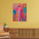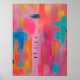 Bold abstract brushstrokes in shades of pink, orange, and blue.