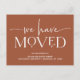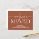 These seriously modern, terracotta moving announcements feature elegant, ornamental white text for a boho new look that is still timeless and classy. A stylish way to let friends and family that you have moved to a new home!