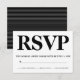 Bold black and white typography wedding RSVP response card. The back includes a white striped pattern on black.