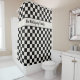 Add a bold accent to your bathroom decor with a custom shower curtain featuring a cool black and cream chequered pattern made of rows of alternating off-white and black squares with your family name in a stylish black script within a cream band 1/3 from the top.