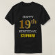 This simple birthday-themed, black-coloured shirt design features a warm birthday wish like "HAPPY 19th BIRTHDAY, STEPHEN!" on the front, in bold text. The birthday number has a faux/imitation gold-like colouring appearance. The name on the front can be personalised. A birthday-themed shirt like this could be a fun way to deliver birthday wishes to somebody who is celebrating their nineteenth birthday. [~Z0000318]