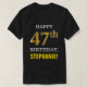 This simple birthday-themed, black-coloured shirt design features a warm birthday wish like "HAPPY 47th BIRTHDAY, STEPHANIE!" on the front, in bold text. The birthday number has a faux/imitation gold-like colouring appearance. The name on the front can be customised. A shirt like this could be worn at a birthday party for somebody who is celebrating their forty seventh birthday. [~Z0000318]