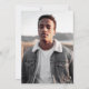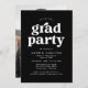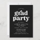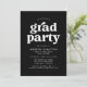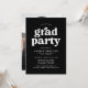 Stylish graduation party invites featuring "grad party" displayed in bold white lettering with the graduate's name and party details shown below on a black background. The back of the black and white graduation party invite features the graduate's vertical photo. The simple graduation party invites are perfect for both high school and college graduates.