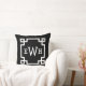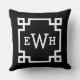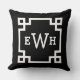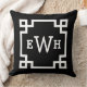 A bold black throw pillow featuring a customisable three-letter monogram inside a white Greek key geometric border frame. The dramatic white-on-black design delivers a striking, modern accent for living rooms, offices, or bedrooms. Personalise with your initials or a couple's monogram for a statement gift.
