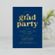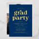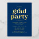 Stylish graduation party invites featuring "grad party" displayed in bold gold foil lettering with the graduate's name and party details shown below on a blue background. The back of the blue and gold graduation party invite features the graduate's vertical photo. The simple graduation party invites are perfect for both high school and college graduates.