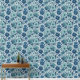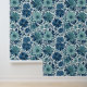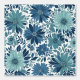 This design features a vibrant and elegant floral pattern composed of large, stylised flowers in varying shades of blue and teal. The blossoms are intricately detailed with fine lines and central dot clusters, surrounded by an array of leafy branches and smaller blooms. Set against a clean white background, the contrast enhances the cool, calming colour palette, making the design feel both fresh and sophisticated. It evokes a sense of natural beauty and serenity, perfect for textiles, wallpapers, or stationery.