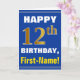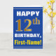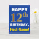 This simple birthday-themed greeting card design features a warm birthday wish like "HAPPY 12th BIRTHDAY, First-Name!" on the front, in bold text on a blue coloured background. The birthday number has a faux/imitation gold-like colouring appearance. The name on the front can be customised. The inside features a customisable birthday message. A greeting card like this could be a fun way to deliver birthday wishes to somebody who is celebrating their twelfth birthday. [~Z0000278]