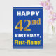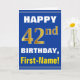 This simple birthday-themed greeting card design features a warm birthday wish like "HAPPY 42nd BIRTHDAY, First-Name!" on the front, in bold text on a blue coloured background. The birthday number has a faux/imitation gold-like colouring appearance. The name on the front can be customised. The inside features a birthday message that can be personalised. A greeting card like this could be a fun way to deliver birthday wishes to somebody who is celebrating their forty second birthday. [~Z0000278]