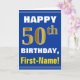 This simple birthday-themed greeting card design features a warm birthday wish like "HAPPY 50th BIRTHDAY, First-Name!" on the front, in bold text on a blue coloured background. The birthday number has a faux/imitation gold-like colouring look. The name on the front can be customised. The inside features a birthday message that can be customised. A greeting card like this could be a fun way to deliver birthday wishes to somebody who is celebrating their fiftieth birthday. [~Z0000278]