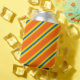 Bold pattern in colours of blue, yellow and orange diagonal stripes.