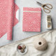 A pink Christmas wrapping paper with a bold candy cane and snowflake pattern .