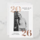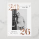 Modern graduation party invitations featuring the graduate's vertical photo framed in white with 2024 in bold, rose gold foil lettering at the top left and bottom right corners. Personalise the front of the photo graduation party invites with the graduate's name and school name. The foil graduation invitation reverses to display your party details in white lettering with a black background. The background colour can be changed to a colour of your choice with our edit design feature. The rose gold graduation party invites work perfectly for both high school and college graduation parties.