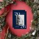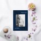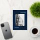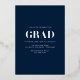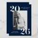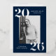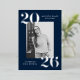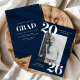 Modern graduation party invitations featuring the graduate's vertical photo framed in navy with 2025 in bold, silver foil lettering at the top left and bottom right corners. Personalise the front of the photo graduation party invites with the graduate's name and school name. The foil graduation invitation reverses to display your party details in white lettering with a navy background. The background colour can be changed to a colour of your choice with our edit design feature. The navy graduation party invites work perfectly for both high school and college graduation parties.