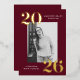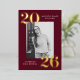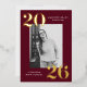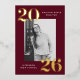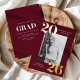 Modern graduation party invitations featuring the graduate's vertical photo framed in burgundy with 2026 in bold, gold foil lettering at the top left and bottom right corners. Personalise the front of the photo graduation party invites with the graduate's name and school name. The foil graduation invitation reverses to display your party details in white lettering with a burgundy background. The background colour can be changed to a colour of your choice with our edit design feature. The burgundy graduation party invites work perfectly for both high school and college graduation parties.