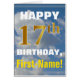 This simple birthday-themed greeting card design features a warm birthday wish like "HAPPY 17th BIRTHDAY, First-Name!" on the front, in bold text on a background depicting a blue sky with white and gray clouds. The birthday number has a faux/imitation gold-like coloring look. The name on the front can be personalized. The inside features a customizable birthday message. A greeting card like this could be a fun way to deliver birthday wishes to somebody who is celebrating their seventeenth birthday. [~Z0000284]