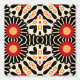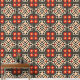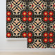 This peel and stick wallpaper features a captivating design with bold colours and intricate patterns. The dominant colours are black, red, orange, and white. The red flowers have orange centres, creating a vibrant contrast against the dark background. The graphic style leans towards folk art. It feels handcrafted, as if someone painted it directly on the wall. The organic shapes and imperfect outlines give it an authentic, free-spirited vibe. The repeating pattern includes stylised floral motifs and tear-shaped elements. The flowers are interconnected by delicate black lines, forming an intricate network.