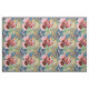 A bold exotic abstract floral pattern in bright shades of blue, green, gold, and burgundy.