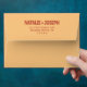 A retro modern hand written bright colourful wedding envelope. Which features bold bride and groom's names in rust colour. And personalised return address . On simple vintage colour background. Which suits the whole wedding suite.