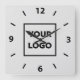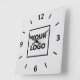 Create your own modern square wall clock for your business featuring your logo on a neutral grey background with bold black numbers and dashes around the edge. Replace the sample company logo with your own in the sidebar. Your logo can be a circle, square, or another shape, and in colour or black and white. Click to customise further if you need to adjust the size of your logo with the scale buttons. If you want the background colour to show through your logo, upload a version of your logo with a transparent background.