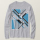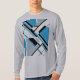 An abstract art graphic, in a nod to the Mid-Century Modern style, is created in the combination of bold geometric shapes in medium blue and grey with black elements, with the overall design slanted on the diagonal. Both contemporary and retro in style, the design is pictured here on a "grey" long-sleeved t-shirt, with other styles and colours available to choose from. This is a creative, unusual, and trendy look, suggestive of a mosaic tile pattern or modern art image, to brighten your casual and everyday wear, whether hanging out at home or with friends, playing sports, or going about town. Since the shirt lends an artistic vibe and projects a personal individualised style, this contributes to a feeling of being "put together," which is especially energising for those who work remotely and/or spend a lot of time at home and makes clothes fun again.