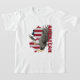 This children’s T-shirt features a dynamic graphic design of an eagle in mid-flight with its wings spread wide, superimposed on the silhouette of a map outline of the United States. The background includes an American flag pattern with red and white stripes and a blue field with stars. The word “AMERICAN” is prominently displayed across the design in bold, capital letters. This design symbolises American pride and identity, making it a perfect choice for young patriots.