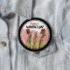 This HAND-DRAWN BUTTON features delicate watercolor hands holding roses and tulips, framed by a BLACK ORNAMENTAL border.