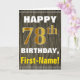 This simple birthday-themed greeting card design features a warm birthday wish like "HAPPY 78th BIRTHDAY, First-Name!" on the front, in bold text on a faux wood appearance pattern background. The birthday number has a faux/imitation gold-like colouring appearance. The name on the front can be personalised. The inside features a birthday message that can be personalised. A greeting card like this could be a fun way to deliver birthday wishes to somebody who is celebrating their seventy eighth birthday. [~Z0000280]